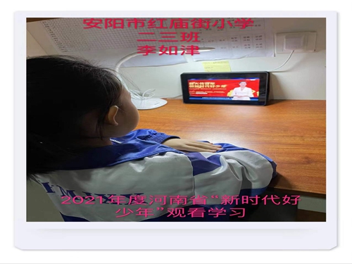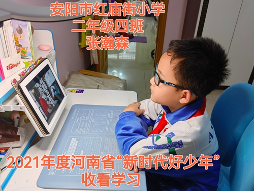 安阳市红庙街小学组织二年级学生观看新时代好少年发布活动时间:2022-01-22 为认真贯彻落实党的十九大提出的“培养担当民族复兴大任的时代新人”的要求,锻造中国特色社会主义事业建设者和接班人。1月20日,安阳市红庙街小学二年级积极响应少先队大队部号召,深入开展学习2021年度“新时代好少年”先进事迹发布活动,共192名少先队员进行线上学习。 虽然是线上学习,学生们的学习热情不减,学习激情高涨。各班主任在班级群里发布“新时代好少年”先进事迹活动在线上进行后,学生纷纷穿上校服,戴上红领巾,第一时间坐在电脑或手机前进行观看学习。一个个端正的坐姿,一双双专注的眼神,一个个坚定的背影,他们正用自己的行动来诠释“听党话,跟党走,做新时代好少年。” “薪火传百年,做新时代好少年”活动中的十位好少年,激励着每一位线上学习的少先队员。他们心中有梦想,身边有榜样,定会珍惜大好年华,求学上进,强健体魄,锤炼意志,做对国家,对人民,对社会有用的人,为建设社会主义现代化强国,为实现中华民族伟大中国梦,时刻准备着。 |