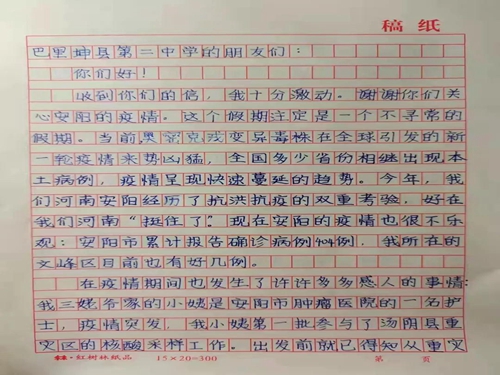安阳市第一实验小学与巴里坤县二中队员开展手拉手活动时间:2022-01-22 近日,新疆巴里坤县二中学校的队员们从媒体报道中获悉安阳出现了疫情,他们第一时间用暖心的话语送来温暖;精心制作手抄报为保护大家的“大白”加油、祝福;以童心颂信心,鼓励安阳市第一实验小学的红领巾伙伴们保持积极向上的心态,坚定战胜疫情的决心。少先队员手拉手,民族团结一家亲。 巴里坤县二中的少先队员们用自己灵巧的双手绘制出一幅幅手抄报与绘画作品,致敬抗疫一线的英雄,表达对实小学生满满的牵挂与关心,凝聚奋进的力量,传递胜利的希望。 安阳市第一实验小学的队员们也纷纷回应,或书信传情,或隔屏诉说,表达了实小学生对手拉手队员们的感激和祝福。 他们表示:只要团结一心、同舟共济,一定会夺取抗击疫情斗争的最终胜利。 |