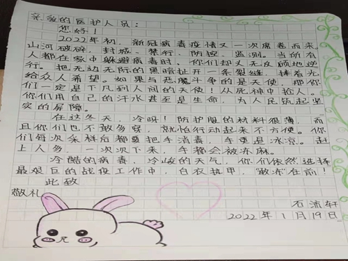 西大街小学的少先队员们看到那些舍小家为大家的志愿者们、老师们奔赴抗疫一线,深受感动。少先队员们以书信、小视频、贺卡等形式为志愿者送去了祝福。