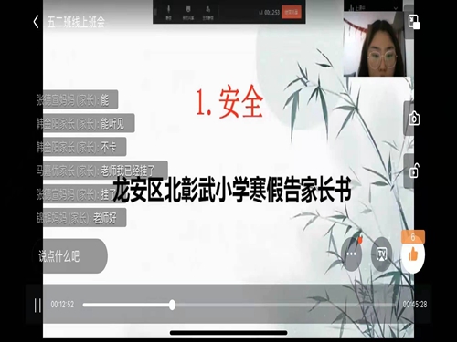 1月25日,龙安区北彰武小学五二班召开了“童心抗疫情,线上迎寒假”主题班会。