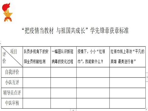 文峰区(高新区)红领巾争章学先锋章活动时间:2022-01-26 为全面贯彻落实《中共中央关于全面加强新时代少先队工作的意见》,逐步建立政治导向鲜明、争章形式多样的阶梯式成长激励体系,稳步推进“红领巾奖章”工作落地见效。结合当前安阳疫情,近日,文峰区(高新区)少工委组织和部署了各校少工委的特色争章活动——学先锋章,共同助力疫情防控。 全区各校少工委积极行动,落实方案,规范争章程序,注重阶梯贯通。各校号召队员们做争章前的准备,围绕“我看核酸检测”、“病毒无处藏身”、“红领巾我能行”,多才多艺助抗疫,强健体魄助抗疫,精美作品助抗疫,线上寻访“先锋”等活动进行争章。队员们经过努力,获得了属于自己的先锋章。 通过这次争章活动,多种形式生动传播了中国制度的优势,坚持人民至上的价值理念。逆行者的坚定来自于中国共产党坚强的领导。队员们表达了从小学先锋、长大做先锋,努力成长为中国特色社会主义事业的合格建设者和可靠接班人的坚强决心,展示出朝气蓬勃、昂扬向上的精神风貌。 |