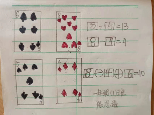 为了让学生度过一个充实、快乐、有意义的寒假,近日,文峰区东风小学一年级数学组将数学计算与扑克牌相结合,设计了一份实践型作业来点缀学生的虎年寒假。