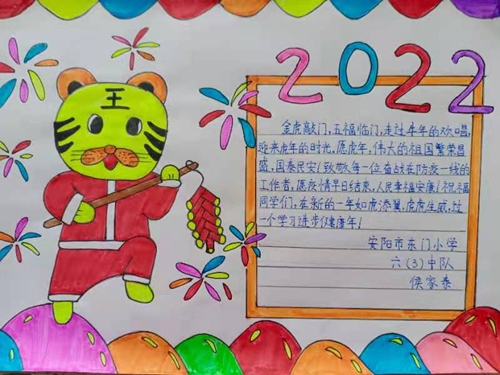 安阳市东门小学寒假特色活动时间:2022-02-03 1月31日,安阳市东门小学的队员们在“五小”特色活动的倡导下,为大家带来了既传统又新颖的“贺岁大片”——《五小少年虎年行,虎虎生威齐贺岁》。 经历了疫情之后,队员们迅速成长起来,他们关注疫情,心系家乡,“平安”“健康”是队员们对家乡、对亲朋最朴素的祝愿。五彩的画笔、诚挚的话语寄托着队员们的美好愿景,传递着队员们向上、向善的追求。 一年一次的年夜饭,队员们化身劳动小帮手,和家人一起包饺子。拌馅、和面、擀皮、捏褶,学习包饺子的劳动技能,感受团圆佳节的美好氛围。年夜饭,吃的是喜悦,品的是亲情,缕缕饭香中闻到的是家的味道。一家老小互敬互爱、共叙天伦,围坐餐桌旁,倍感幸福。 队员们的“云拜年”提前送到,他们通过“线上拜年”的方式向老师、同学以及因疫情未能回家的亲人们送上新春的问候。 辞旧迎新又一年,伴随着队员们温暖、灿烂的笑脸,2021缓缓落幕,虎虎生威的2022年正向大家走来。让我们满怀喜悦的心情,共同迎接美好新年的到来! |