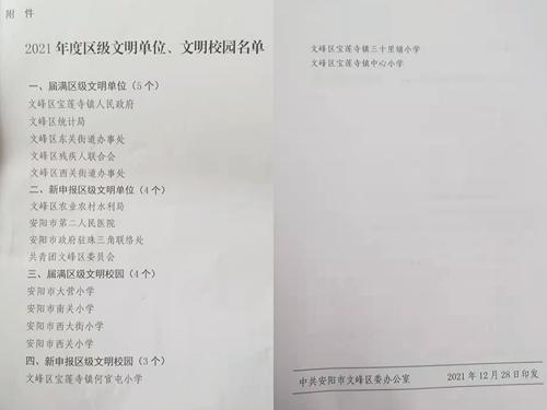 文峰区宝莲寺镇中心小学喜获区级文明校园荣誉称号时间:2022-02-13 2月11日,文峰区宝莲寺镇中心小学喜获“2021年度区级文明校园”荣誉称号。 在创建文明校园过程中,学校秉承“以人为本,和谐发展”的办学理念,以学生为中心,加强师德建设,重点围绕领导班子建设、学校办学管理建设、教师队伍建设、思想道德教育、校园文化建设、活动阵地建设等方面开展工作。在校长杨克雷的带领下,各部门齐抓共管,取得了突出成绩,被评为“2021年度区级文明校园”。 校园,因文明而更加和谐;文明,让校园更加精致。全体师生正以时不我待的紧迫感和使命感,从创建文明校园出发,汇聚文明的力量,奋力书写宝莲寺镇中心小学的辉煌新篇章。 |