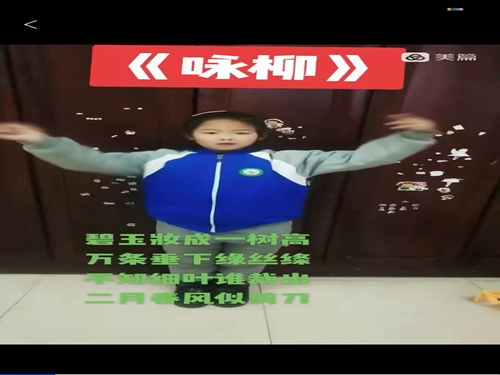 学生积极吟唱古诗词《咏柳》、《舟夜书所见》、《二十四节气——立春》。用“和诗以歌”的形式将传统诗词经典与现代流行相融合,兼顾诗词文化上的意境悠远和表现形式的通俗易懂,将经典诗词用唱歌和手势舞来演绎,生动诠释了传统文化的深刻内涵,同时学生在传唱中收获了快乐,学会了热爱生活,展现了何小学子积极向上的精神风貌和良好的艺术风采。