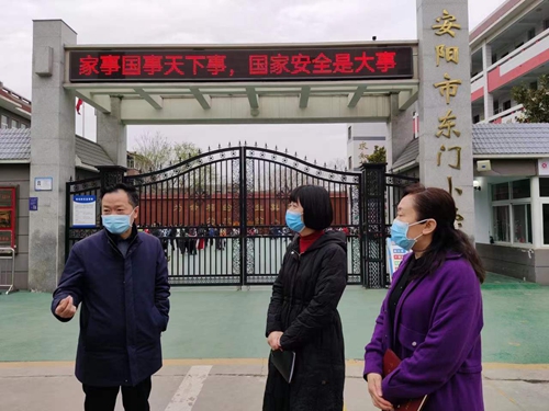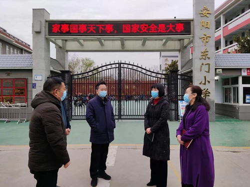 文峰区政府党组成员汤鹏到安阳市东门小学进行疫情防控调研时间:2022-03-17 3月17日,文峰区政府党组成员汤鹏在区教育局党组书记、局长靳建锋及班子成员陪同下,到安阳市东门小学实地走访调研疫情防控工作。 韩建勇校长就学校疫情防控及校园安全工作进行了详细汇报。调研组对学校有疫情防控专班、详实的疫情防控方案和规范、具体的操作流程表示满意;对学校安全制度、措施和器材器械摆放、使用防护到位,分层责任到人的严密部署表示赞许。 安阳市东门小学现在实行封闭式管理。做到“一不准六坚持”,即:外来人员不准入校;坚持疫情防控知识宣传周周有;坚持师生、家属、家长外出排查不遗漏;坚持师生每天晨午检、病因跟踪及时记;坚持日报告、零报告制度不拖延;坚持每日消毒、通风不松懈;坚持师生每周核酸检测不漏人。 学校的防控措施和安全工作受到党组成员汤鹏同志的肯定,针对当前的疫情形势,汤鹏要求:一要强化动态排查,重点排查师生及家长、家属外出情况,同时要对学校保洁、保安、厨师等后勤从业人员进行详细排查,务必做到全覆盖,无死角。二要抓好常态化疫情防控工作,坚持“戴口罩、测体温、一米线”的日常管理,落实“周核酸”“日报告”制度,发挥“十个哨点”的预警作用。三要压实学校各级责任,激活应急响应机制,明确责任分工,细化各项措施,为广大师生创造健康有序的校园环境。 疫情防控,重在常态,贵在坚持,东门小学表示,将继续严格执行疫情防控各项措施,筑牢平安校园防护墙。 |