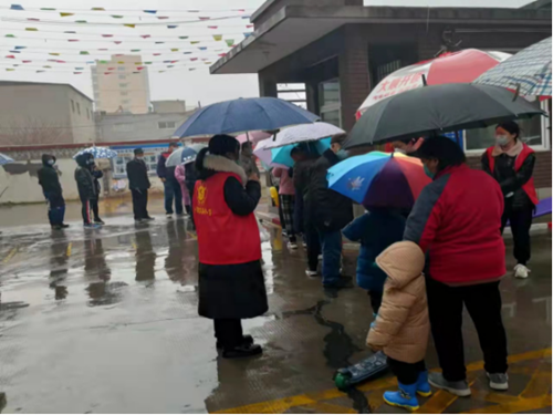 检测活动期间下起了雨,但志愿队员们依然在寒风冷雨中坚守,直到核酸检测活动结束。