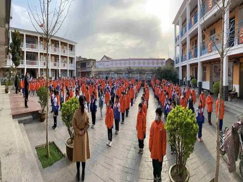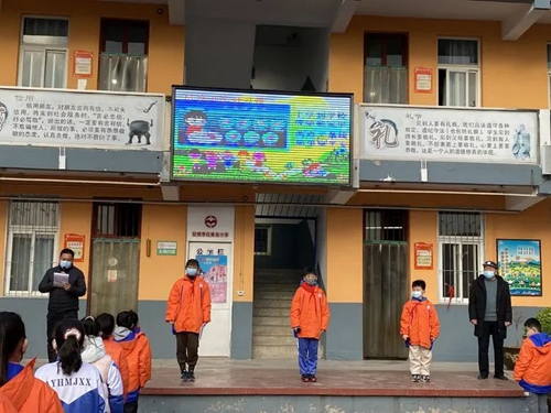 3月28日,安阳市红庙街小学迎来本周的升旗仪式,由于现在疫情的原因,该校二、五年级学生,在教室里进行升旗仪式,其他年级在室外集中进行升旗仪式,人与人之间保持至少1米的距离,在操场上开始升旗仪式。