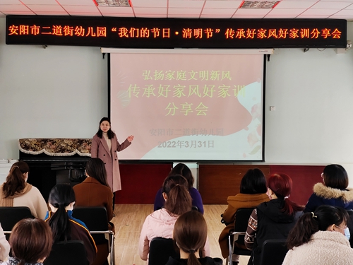 安阳市二道街幼儿园开展清明节传承好家风好家训分享会活动时间:2022-03-31 为大力弘扬中华优秀传统文化,培育和践行社会主义核心价值观,进一步开展好园所的精神文明建设工作,3月31日,安阳市二道街幼儿园开展了“我们的节日·清明节”传承好家风好家训分享会活动。 教师代表上台介绍了自己的家风故事,有和父母一起做家务的,从小培养孩子的劳动意识。有陪伴孩子阅读的,营造书香家庭。有祖孙三代互相捶背的场景,其乐融融。教师们互相学习、观摩,用实际行动践行社会主义核心价值观。 老师们看完后深受感动,对家风传承有了更深的理解。和为贵,孝为先,勤为宝,俭为德,知足常乐,待人以善,这些优良的家风就伴随在大家身边。教师表示,要更加注重言传身教,用自己的言行去影响更多的人,让优良的家风得到传承和发扬。 |