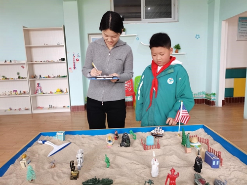 学生来到这里感觉一切都是那么新鲜,游戏前,王老师给大家讲沙盘游戏规则,冯老师耐心教大家如何做好沙盘游戏记录。学生在两位老师的带领下,在沙游世界诉说自己绚丽多彩的梦想。
