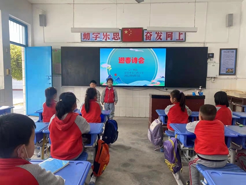 一年级的学生跟着老师一起在校园里探寻美丽的春天,感受校园春光美好,吟诵春天,赞美春天,举办了迎春诗会。配上中国传统乐器的音乐,声与形相结合,娓娓道来关于春天的诗歌。学生展示古诗诵读,大家仔细聆听,感受着春天美丽的景象。