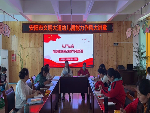 安阳市文明大道幼儿园开展能力作风建设年活动时间:2022-04-12 4月11日,安阳市文明大道幼儿园在多功能厅进行了能力作风大讲堂活动,王云霞园长作主要发言。 王园长指出,今年要以能力作风建设年为抓手,打造“能力要过硬,作风要正派”高素质教师队伍。并要求:一要查找本职工作是否尽心尽职尽责,促进自身能力提升;二要开展业务练兵,促进教师专业能力提升;三要做好家园沟通,促进家长工作能力提升;四要增强领导团队凝聚力,促进领导作风能力提升。要始终保持严的基调,严以律己、严以修身,严以用权,作风要严,纪律要严,工作标准要严。 努力形成安阳市文明大道幼儿园作风大优化、效能大提升、发展大提速的良好态势。 通过本次能力作风大讲堂活动,参会老师纷纷表示,在今后的工作中,感到方向更明确,目标更准确,措施更得力,必定会引领全园党员干部教师树新风、重实干、促发展努力提升工作能力,切实优化工作作风,推动幼儿园各项工作再上新台阶。 |