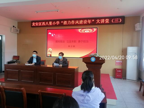 龙安区西八里小学开展能力作风建设年大讲堂活动时间:2022-04-21 4月20日,龙安区西八里小学在多媒体教室开展“能力作风建设年”大讲堂活动。本次活动由燕飞副校长主持,靳卫国副校长主讲。 靳卫国副校长主讲的题目是《爱岗敬业 立足本职 勇于担当》。靳校长强调:全体教师都应当爱岗敬业、立足本职、勇于担当。干好本职工作,就要做到如下几点:要热爱本职岗位。要勇于承担责任。要加强业务学习。要提高创新意识。要善于总结经验。要善沟通、重协作。干一行,爱一行,专一行,精一行。立足本职,努力学习,不断创新,把爱岗敬业的精神写在三尺讲台。 燕飞副校长带领全体教师学习教育部等七部门印发《关于加强和改进新时代师德师风建设的意见》的通知。 西八里小学先锋人物侯小会老师发言:《在平凡岗位上用“心”教书育人》。侯小会老师担任中高年级英语老师和英语教研组长,工作平凡而繁琐。她静下心来教书,潜下心来育人,努力上好每一节课,力争做好每一件事,细心教育好每一位学生,为西小教育培养了一批又一批莘莘学子。 在今后的工作中,西小全体教师表示,将一如既往地静心教学,潜心育人。 |