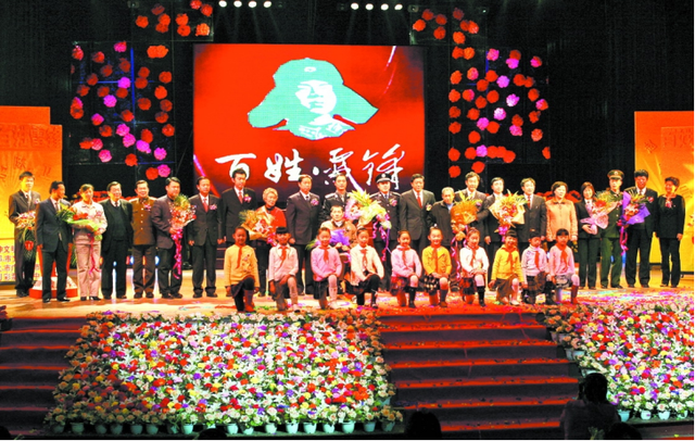 说明词:“百姓雷锋”品牌知名度和影响力扩展全国。2010年,雷锋生前战友乔安山,全国诚实守信道德模范武秀君,“英雄试飞员”李中华,“草原英雄小姐妹”龙梅、玉荣,“当代雷锋”郭明义,全国劳动模范李素丽,学雷锋金质奖章获得者邓凤兰(从左至右),被抚顺市委、市政府授予“百姓雷锋”特别奖