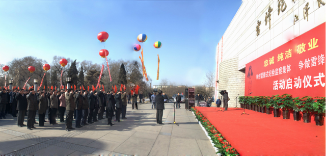 序厅正面:在雷锋的旗帜下,百姓雷锋昂扬行进群塑