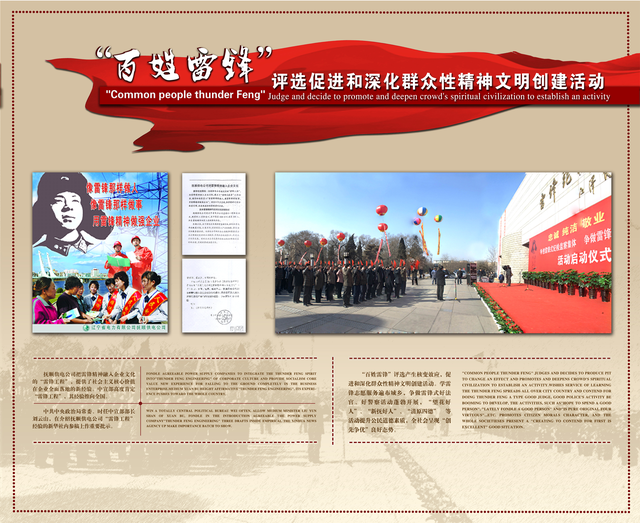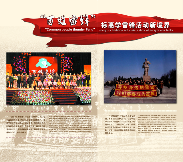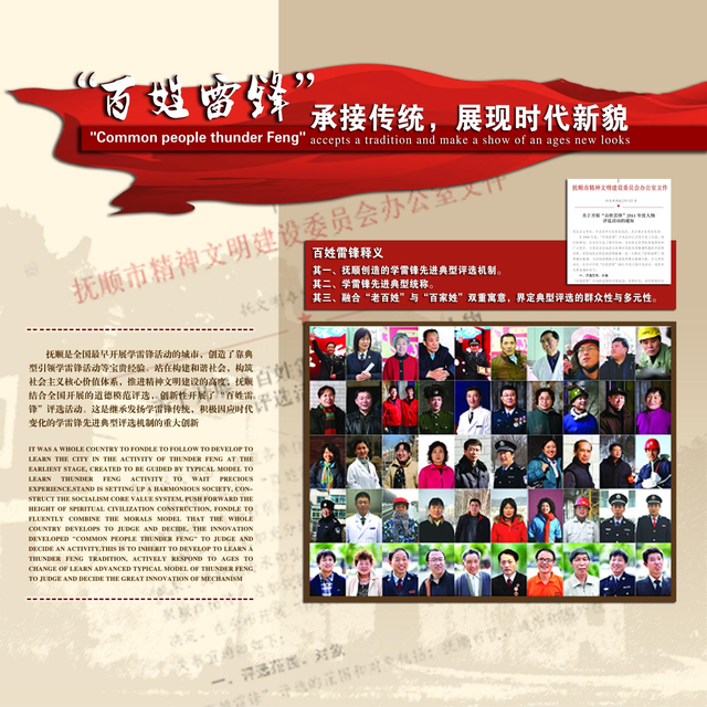 说明词:“百姓雷锋”评选产生核变效应,促进和深化群众性精神文明创建活动。学雷锋志愿服务遍布城乡,争做雷锋式好法官、好警察活动蓬勃开展,“望花好人”、“新抚好人”、“清原四德” 等活动提升公民道德素质,全社会呈现“创先争优”的良好态势