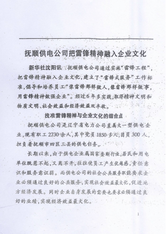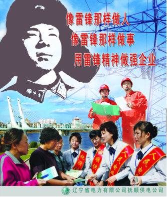 说明词:抚顺供电公司把雷锋精神融入企业文化的“雷锋工程”,提供了社会主义核心价值在企业全面落地的新经验。中宣部高度肯定“雷锋工程”,将其经验推向全国