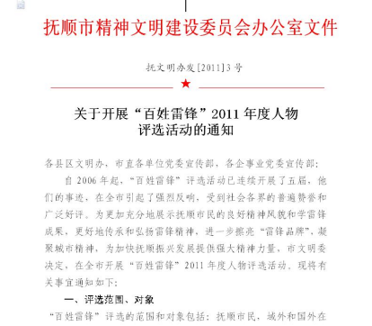 抚顺是全国最早开展学雷锋活动的城市,创造了靠典型引领学雷锋活动等宝贵经验。站在构建和谐社会,构筑社会主义核心价值体系,推进精神文明建设的高度,抚顺结合全国开展的道德模范评选,创新性开展了“百姓雷锋”评选活动。这是继承发扬学雷锋传统,积极因应时代变化的学雷锋先进典型评选机制的重大创新