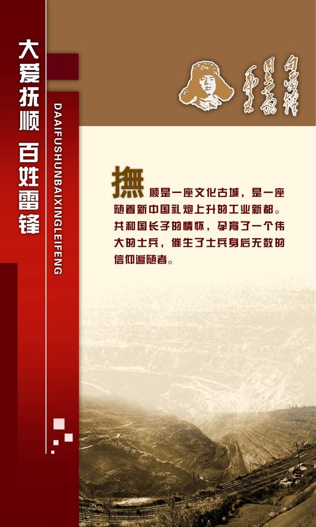 说明词:在新中国能源、资源最为短缺的年代,抚顺因贡献了大量的煤、油、电、钢、铝而举世闻名。抚顺善于创造、无私奉献的人文环境,与雷锋为人民服务的思想相融合,迅速升华为集人类美德于一体的雷锋精神。在学雷锋活动中产生的“百姓雷锋”,是抚顺厚重雷锋文化浸润的必然结果。传承雷锋精神是百姓雷锋的特征与使命
