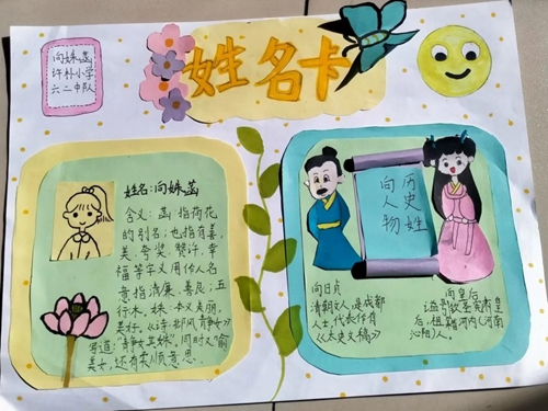 学生们对这项活动兴趣浓厚,大家纷纷通过查字典、查资料等方式,来深入了解自己名字的由来。低年级的学生用稚气未脱的声音朗读《百家姓》,中年级的学生大声讲出自己名字背后的故事,最好玩的还是高年级的姓名卡,可谓创意满满,姓名与配图相得益彰。
