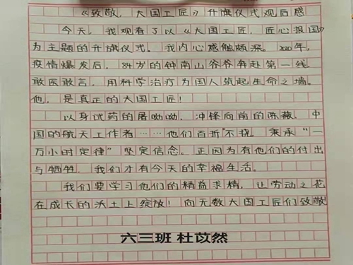 安阳市东门小学开展线上升旗仪式暨国际劳动节主题活动时间:2022-04-26 为学习贯彻习近平总书记系列重要讲话精神,大力弘扬劳模精神、劳动精神和工匠精神,4月25日,安阳市东门小学全体队员和中队辅导员,相约屏端,参加“致敬工匠”网上升旗仪式暨“五一”国际劳动节主题活动。 全校少先队员佩戴好红领巾,集结在屏幕前,参加本次线上升旗仪式,认真观看和聆听大国工匠的事迹。器型有形,匠心无界。小到一枚螺丝钉、一块只能芯片、大到航母高铁、火箭卫星,背后都离不开“执着专注、精益求精、一丝不苟、追求卓越”的工匠精神。 低年级学生用镜头致敬劳动者:一幅幅画面记下他们坚守岗位的那份执着,一一帧帧照片,拍下劳动者最美的样子。中年级学生用画笔致敬劳动者:一张张精美的绘画作品,是对劳动者的赞美,是对劳动者的歌颂。高年级学生用笔尖致敬劳动者,一笔一画间,是敬意的流露,一字一行里,是决心的表白。 学生纷纷表示,要学习大国工匠“干一行专一行”的精益求精,“偏毫厘不敢安”的一丝不苟,“千万锤成一器”的卓越追求,秉承“一万小时定律”,坚定“择一事,终一生”的信念,付诸“钻一行,精一行的努力,成就“工一技,匠一心”的品质。 东门师生表示,将继续努力,悟匠心、铸匠魂、践匠行,弘扬新时代大国工匠精神,助力民族复兴大业。 |