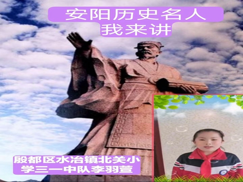 三年级四个中队的学生用视频讲解的方式来赞美自己的家乡,讲解历史名人。盘庚迁殷、武丁中兴、奴隶傅说拜相、女将军妇好、文王拘而演《周易》、西门豹投巫治邺地、蔺相如降生古相村、信陵君窃符救赵、项羽破釜沉舟、曹操邺城发迹、三朝宰相韩琦、抗金名将岳飞等名人轶事层出不穷。学生用自己深情的朗诵讲述着安阳千百年来的历史故事。