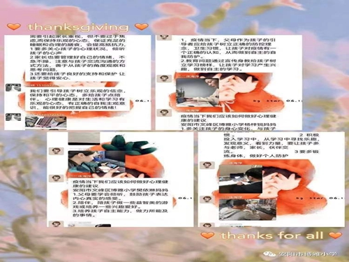 为切实加强新冠疫情防控工作,减少疫情对队员们可能造成的心里困扰和负面影响,消除恐慌,近日,在文峰区(高新区)少工委带领下,各校少工委共同抗击新冠疫情,家校携手,引导队员积极应对,用“心”战“疫”,打败“情绪小怪兽”。 各校少工委迅速成立领导小组,制定工作计划,细化工作方案,组建心理辅导团队,提供专业化、个性化的指导和服务。同时利用公众号,视频号,班级群等多种渠道,发布疫情防护知识,心理科普类文章等增强心理韧性,进行自我心理保健。 每天有关疫情的信息充斥着网络、手机等,这些信息无时无刻不影响着家长和队员们的情绪,中队辅导员们及时上好线上心理健康教育主题班会,答疑解惑,引导队员对战胜疫情、恢复秩序树立坚定的信心。线上心理援助课程,教会学生简单的情绪调节方式,对队员们开展远程心理健康指导。家长和队员一起行动,形成家校合力,共同指导队员掌握缓解负性情绪的方法。情绪调整手势操,情绪反应变脸杯,心理健康手抄报,队员们用积极乐观的态度,合理表达自己的情绪,用阳光心态拥抱居家生活。 在这特殊时期,各校少工委同心抗疫,筑就队员们健康成长的坚强堡垒,为队员们撑起一片蓝天,营造和谐成长环境,积极面对,共克时艰。 |