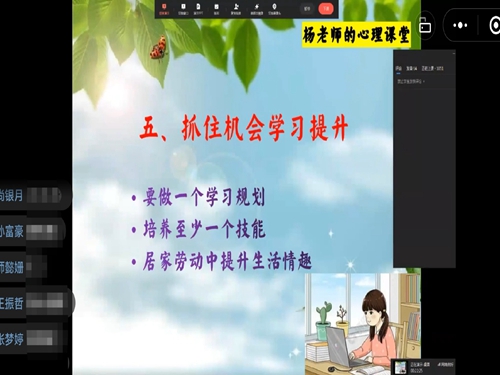 学校心理健康老师杨莹,给全校一千多名学生上了抗疫心理第一课——《为心灵穿上“防护服”》。虽是线上直播课,但吸引了全校学生的认真聆听。