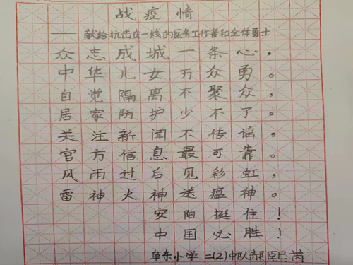 为助力打赢这场没有硝烟的防疫攻坚战,讴歌大美,书写大爱,4月28日,殷都区水冶镇阜东小学开展了“以笔为援,共同抗疫”线上书法比赛。