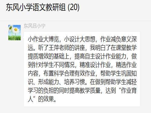文峰区东风小学“双减”之下语文作业设计的思与行时间:2022-05-17 为积极落实中央“双减”政策,减轻义务教育阶段学生过重的课业负担,切实提高新形势下教师的作业设计水平,5月16日,文峰区东风小学在区教研室小学语文教研员的号召下,组织全体语文教师进行了线上教研活动,学习了文峰区东南营片区作业展示交流成果,重点学习了王小宁、王萍、张彬彬、李娇娇老师的四节优质作业设计微课。 四位教师的精彩分享让老师们豁然开朗,她们发现了语文作业设计的新思路与新天地,从基础作业到特色作业,从自主类作业到拓展类作业,再到跨界类作业,老师们深刻认识到双减背景下的语文作业正从封闭走向开放,从独立走向协作,正所谓,小作业大博览,小设计大思想,作业减负意义深远。 “双减”背景下的作业设计,不仅要提高作业设计质量,发挥作业诊断、巩固、学情分析等功能,系统设计符合年龄特点和学习规律、体现素质教育导向的基础性作业,更应该布置分层、弹性和个性化作业,坚决克服机械、无效作业,杜绝重复性、惩罚性作业。围绕这些内容,东风小学各年级语文教师进行了积极研讨,她们表示,一定要发挥团队作用,精心设计每一次作业,力争能唤醒学生的主体意识,从而真正让语文走出课堂,走向广阔的空间。 一份好的作业不仅是反馈调控教学过程的实践活动,更是在教师指导下,由学生独立应用和亲身体验知识、技能的教育过程。东风小学全体语文教师表示,将继续深入学习,把控好“双减”作业的加和减,提质增效,助推每位东风少年五育融合,全面发展。 |