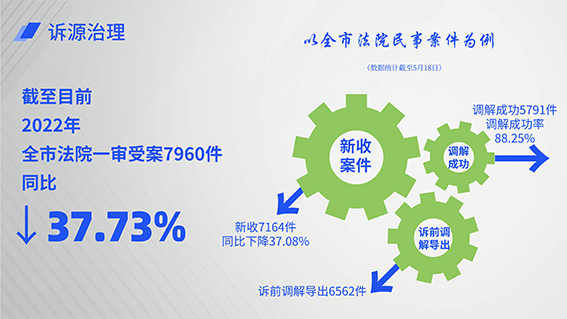 今年年初,根据全省诉源治理工作会议精神,松原中院在全市范围内组织开展了诉源治理提升活动,力求松原法院诉源治理工作再上新台阶。截至目前,2022年全市法院一审受案7960件,同比下降37.73%。以民事案件为例,截至5月18日,松原两级法院新收民事诉讼案件7164件,同比下降37.08%,诉前调解导出6562件,调解成功5791件,调解成功率88.25%。