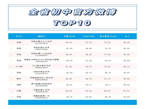 安阳市第三十二中学获省中学官方微博传播力榜单第一名时间:2022-06-05
