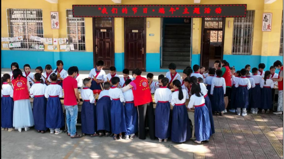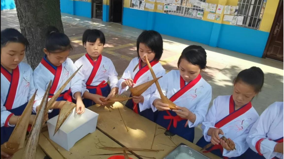 传承文明过端午,粽叶飘香中华情——南阳市侯集镇王官营小学“我们的节日•端午”主题活动时间:2022-06-06 端午将至,粽叶飘香。6月2日,南阳市镇平县葫芦丝协会携手侯集镇王官营小学组织开展“我们的节日·端午”主题活动,以进一步弘扬民族传统文化,用中华优秀传统文化滋养人格教育,提升学生对中华优秀传统文化的认同度,切实增强学生对中华优秀传统文化的自信心,从而引导学生形成正确的世界观、人生观、价值观,不断汲取中国智慧,弘扬中国精神,传播中国价值,厚植家国情怀,培养德智体美劳全面发展的社会主义建设者和接班人。 这次活动注重传统文化传承,引导全体师生在参与活动中体验民俗文化,感受传统节日内涵,增强文化自信,激发团结协作和爱国的热情。 活动现场,志愿者一大早就把提前泡好的粽叶、糯米、红枣、花生、白糖、鸭蛋等食材搬了出来齐整地放置在桌子上,剪线、放米、加馅、包裹、扎线……学生在镇平县葫芦丝协会文艺支援小分队的指导下,卷起粽叶,倒入糯米,放上红枣,缠紧线绳,分工协作、密切配合,一颗颗“青叶红芯”的粽子摆上了桌面,大家你追我赶,活动充满了欢乐、温馨、和谐的氛围。