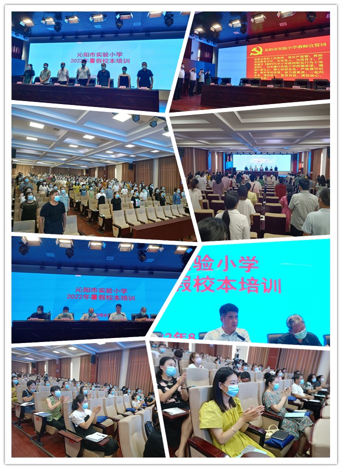 学习跟进 认识跟进 行动跟进 螺旋上升——沁阳市实验小学开展2022年暑期校本培训活动时间:2022-08-19 8月14日上午,沁阳市实验小学举行2022年暑假校本培训开班仪式,全体教师参加活动。 会上,张国宏校长带领全体教师庄严宣誓,不忘教育初心,牢记为党育人、为国育才使命,请党放心、教育有我!随后,张校长向全体教师解读了《沁阳市实验小学教师队伍管理规则》《“奋力提素质,一起向未来”2021-2022学年下学期工作报告》和学校《2022-2023学年上学期工作思路》。 会议强调,新的学期要跟进着力做实四件事。一是提升安全工作素质。二是提升本真教学能力。三是提升立德树人、“五育”并举本领,深入推进素质教育。四是追求家校零距离。稳字当头、稳中求进,实字当头、每天进步,家校社书协同育人,戒慎恐惧化危为机,打赢教育教学追击战,推进教育高质量发展,服务教育强市和“三城一区”建设,以优异成绩迎接党的二十大胜利召开!