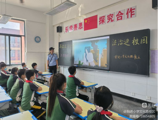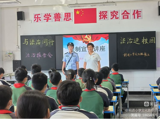与法治同行,法治进校园——商丘市前进小学教育集团文化路校区时间:2022-09-22 为了深化学校法治教育工作的开展,进一步增强同学们的法制意识,加强和谐、平安校园建设,让法治知识走进校园,商丘市前进小学教育集团文化路校区于9月22日上午邀请了商丘市梁园区平原派出所的陈婧警官做了一场法治报告会。