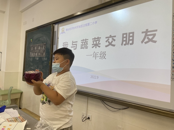 烟台开发区古现第二小学为落实“双减”政策开展劳动教育活动时间:2022-09-26 教育文摘周报9月26日山东讯 “五谷金波诱日月,六蔬绿韵到天庭。”金秋时节,蔬果飘香,在这芳香四溢的季节,为了让同学们更加了解蔬菜的营养价值,感恩蔬菜的来之不易,开发区古现第二小学助力“双减”政策,开展了“我与蔬菜交朋友”综合实践与劳动课程。 慧眼辨识蔬菜