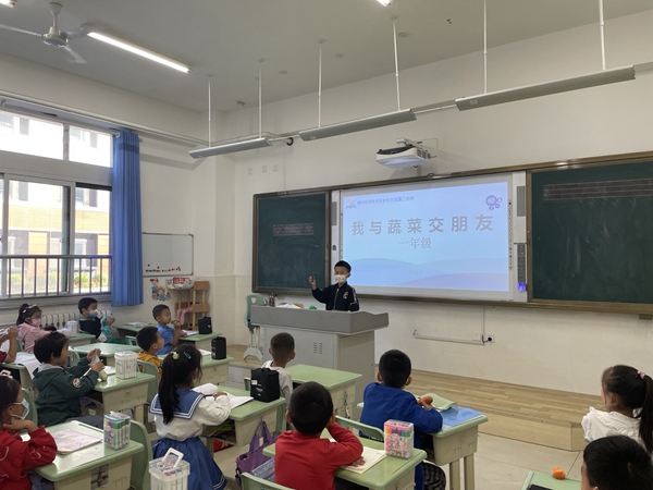 同学们小眼睛注视着老师,观察老师手里的蔬菜,耳朵认真聆听老师的介绍,认识了蔬菜,了解了蔬菜的营养价值,学会了珍惜粮食,体会到了农民伯伯的辛劳! 我为蔬菜代言 人不可一日无“蔬”,小小的身体,大大的能量,形态各异的蔬菜蕴藏着丰富的营养价值,明目健体、代谢免疫……同学们争相介绍自己爱吃的蔬菜,和大家分享他们的食用价值。