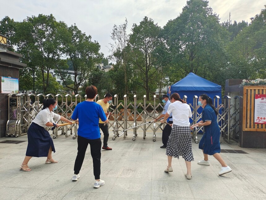 本次演练模拟歹徒冲进幼儿园的场景。入园时分,一名“歹徒”手持“凶器”在幼儿园门口徘徊,而后从大门一跃而进。幼儿园保安人员立即按响报警器,潘晓琴园长立即组织防暴小组拿上钢叉、盾牌等防暴器械防止“歹徒”接近孩子,并与“歹徒”进行对峙。在户外活动的幼儿跟着教师有序的跑到就近的教室进行躲避,及时关闭门窗,用重物堵门,并寻找隐蔽的角落躲避,防止“歹徒”闯入班级伤害幼儿。