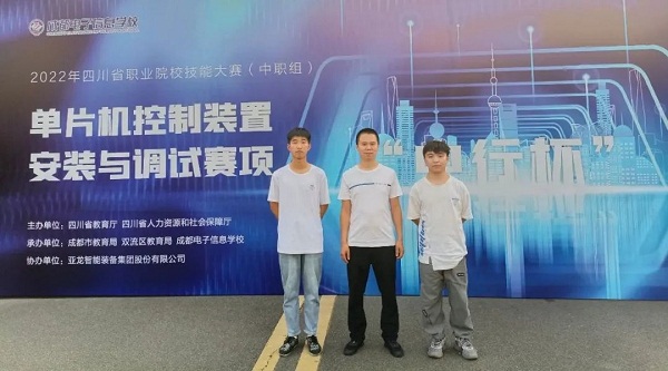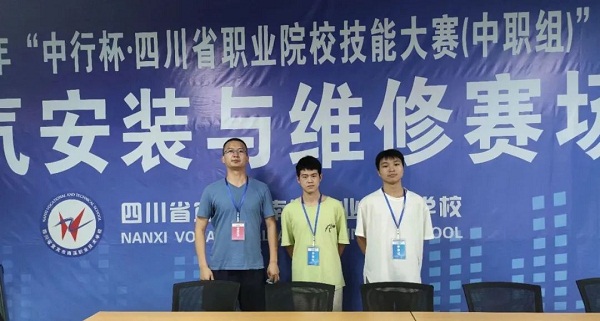 高2023届电子1班学生何强林(中)、陈记宏(右)喜获2022年“中行杯”四川省职业院校技能大赛(中职组)电气安装与维修赛项(学生组)三等奖(左为指导教师岳春城)