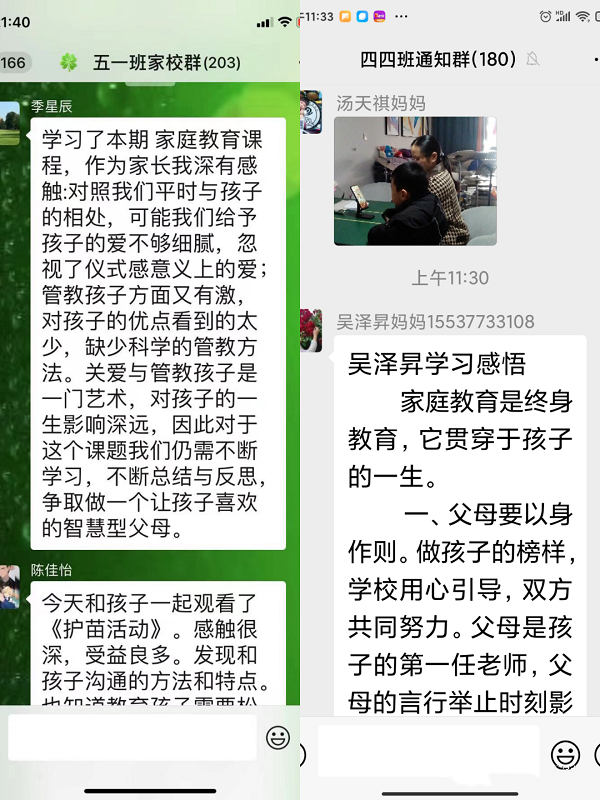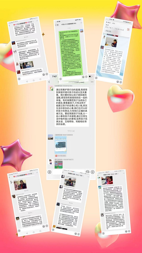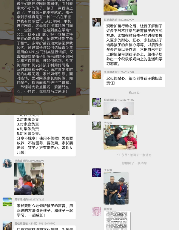 家庭教育“护苗行动”大讲堂深深地触动着每位家长的心。家长们每天陪同孩子一起观看学习,边听边互动,线上学习氛围浓厚,并及时在班级群里或弹屏分享自己的感受和收获:“这样的讲座,针对性和实用性很强,我们都喜欢听!” “这次讲座让我们感触很深,父母不断的学习成长,采用正确的教育方式,是给孩子一生最好的礼物。”