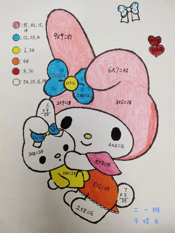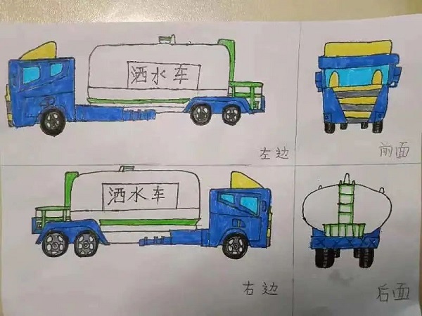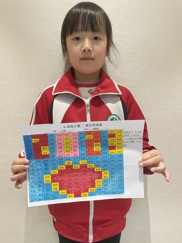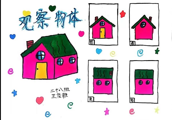 数学计算不枯燥,把计算加入些许艺术气息,将卡通动物、人物等隐藏在算式中,孩子们根据得数,填涂作品。趣味涂色,为算式穿上彩色的外衣,让数学算式美成一幅画。 同学们就地取材,用玩具玩偶做学习材料;从不同位置观察同一物体并画出了三视图,从一个立体图形转换成平面图形的过程中,丰富了图形的表象,积累了数学活动的经验,有助于空间观念的发展。孩子们在实践活动中收获满满!