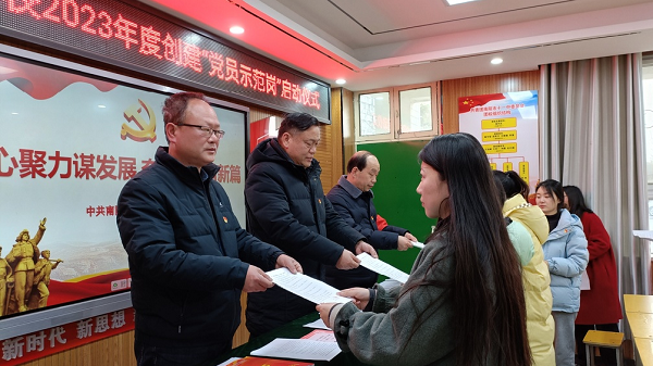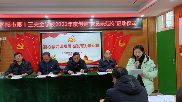 亮身份、亮职责、亮承诺、亮作风、亮业绩 ——南阳市十三全积极开展“党员示范岗”创建活动“一个党员一面旗帜,一个党员一盏灯,一个岗位一份奉献”。 为充分发挥党组织的战斗堡垒作用,促进党员立足本职、爱岗敬业、履职尽责,更好地发挥党员的先锋模范作用,带领和推动学校工作健康发展,2月16日,南阳市第十三完全学校党支部开展“党员示范岗”创建启动仪式活动。