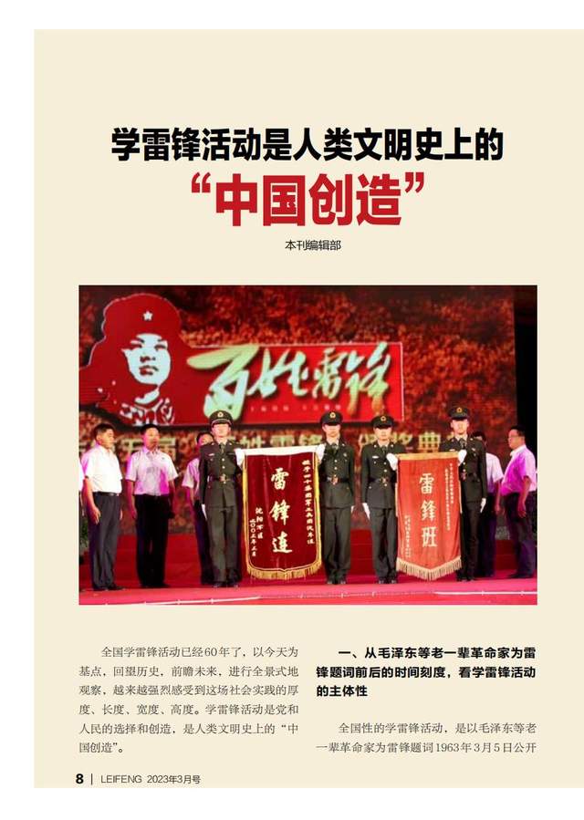 雷锋杂志编辑部文章《学雷锋活动是人类文明史上的 “中国创造”》作为开篇,打开学雷锋60年60个深刻记忆的窗口。文章从四个方面阐述:从毛泽东等老一辈革命家为雷锋题词前后的时间刻度,看学雷锋活动的主体性 ;从雷锋精神的生成发展,看学雷锋活动的时代性;从雷锋精神的文化厚植,看学雷锋活动的民族性;从雷锋精神的对象化,看学雷锋活动的永恒性。