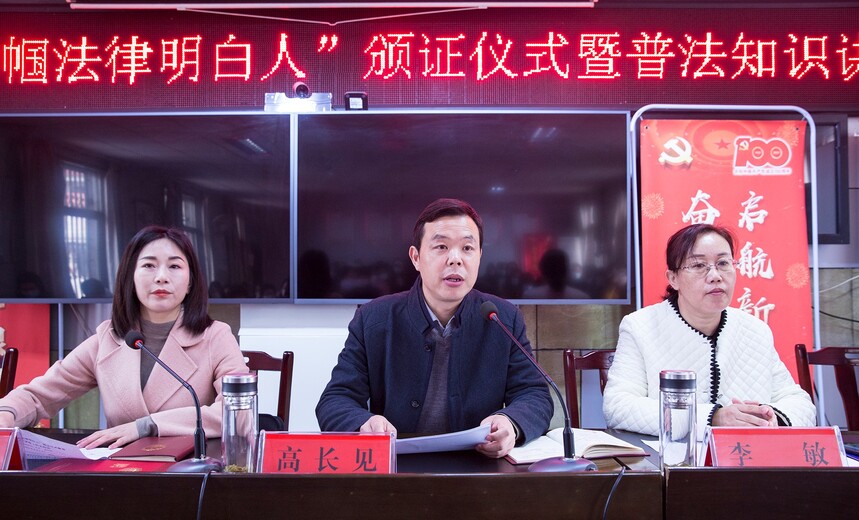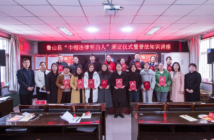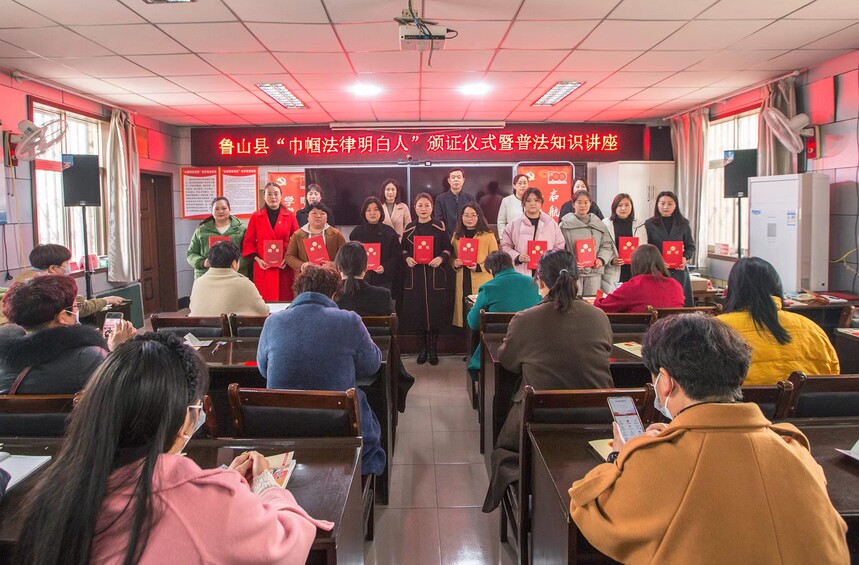 河南:鲁山县举办“巾帼法律明白人”颁证仪式暨普法知识讲座3月1日上午,鲁山县举办“巾帼法律明白人”颁证仪式暨普法知识讲座,县司法局、县妇联相关负责人为“巾帼法律明白人”代表、“两师一队”代表颁发聘书、徽章,并赠书。