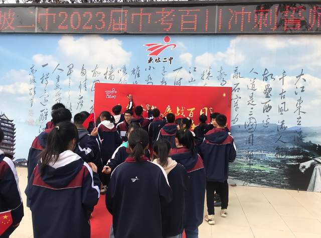 奋力拼搏,备战中考—— 东坡区东坡二中举行中考百日冲刺誓师大会为进一步鼓舞初三全体师生的士气,全力做好2023年中考复习备考工作,2023年3月6日上午10:10 ,眉山市东坡区东坡二中全校师生齐聚运动场,隆重举行2023届中考百日冲刺誓师大会。 大会在庄严的国歌声中开始。誓师大会上,学校领导、教师代表、学生代表相继作了热情洋溢的发言。李利平主任向全体初三师生发起中考百日冲刺的总动员,向初三全体教师表示诚挚的谢意,向全体初三同学致以美好的祝福,并以“自信”、“目标”、“勤奋”等关键词鼓励所有初三学子奋勇拼搏、全力以赴,去谱写人生的新篇章。教师代表李威老师鼓励初三学子用自己的汗水、勇气和毅力去为自己赢得掌声和鲜花,表达了对本届初三的信心与期望。学生代表胡兴佳乐代表初三学子表明决心:绝不辜负父母、老师和学校的殷切期望,一定会以昂扬的斗志奋力拼搏,去争取优异的成绩。 接着初三全体教师庄严宣誓:忠于职守,精诚团结;言传身教,以身作则。脚踏实地,刻苦钻研;甘于奉献,燃烧激情。一声声铿锵有力的誓言把大会推向了高潮。各班也相继发出自己雄壮的誓言,纷纷表示将奋勇冲刺、决战中考,让青春无悔,为父母争光,为母校添彩。大会在初三全体同学的签字仪式和庄严的集体宣誓声中落下帷幕。