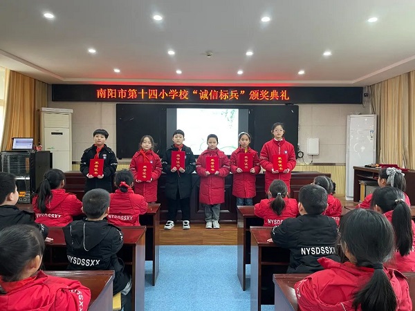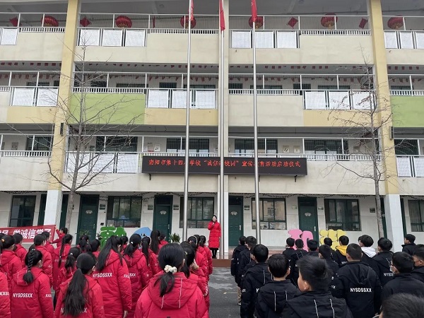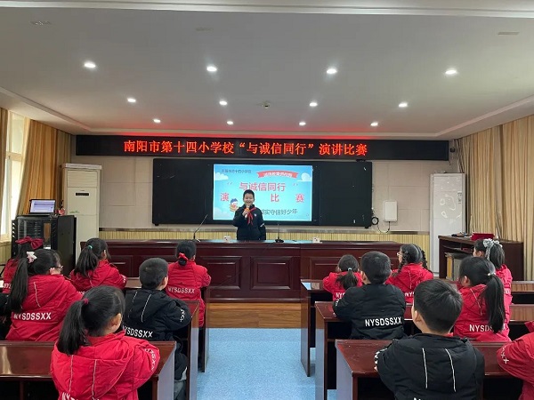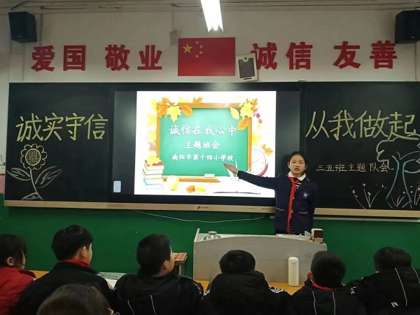 创诚信校园 树诚信学风 做诚信学子——南阳市第十四小学校开展“诚信进校园”宣传月主题教育活动为认真贯彻落实总书记系列重要讲话精神,坚持落实“立德树人”根本任务,进一步加强学生的思想道德建设,南阳市第十四小学校开展了“诚信进校园”宣传月主题教育活动,营造良好的诚信氛围,培养高素质的“四有”合格人才,全力打造“诚信校园”。 营造氛围宣诚信 学校通过全体教师会、升旗仪式、横幅、电子显示屏等形式宣传此次活动,营造良好的诚信氛围,向全校师生诠释诚信真谛,增强践行诚信的能力,争做诚信传播者、诚信倡导者、诚信践行者,共创诚信校园。