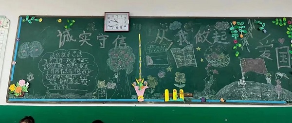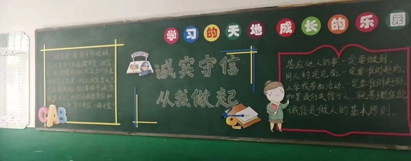 教室板画展诚信 五颜六色的粉笔勾画着斑斓板报,孩子们对“诚信”的理解进一步加深,“诚信”意识逐渐增强,诚信教育日益深化,人人讲诚信、处处守诚信之风吹遍校园。