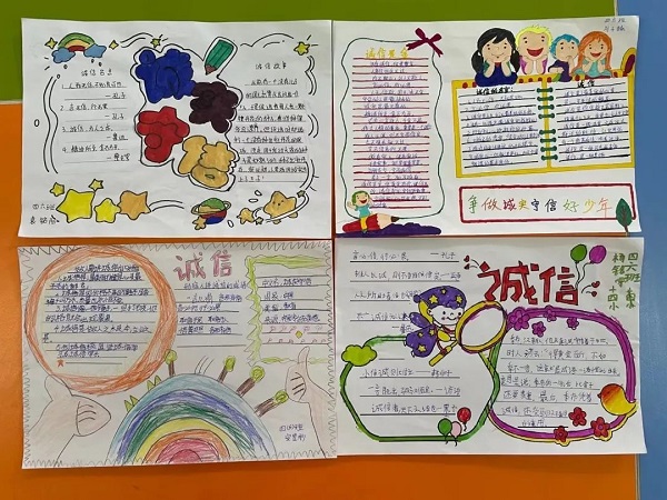 精美小报绘诚信 孩子们大胆构想,精心设计,用一张张图文并茂、内容丰富多彩的手抄报来诠释自己对诚信的理解,诉说诚实守信的意义,诚信的种子在每一位少先队员的心中生根发芽。
