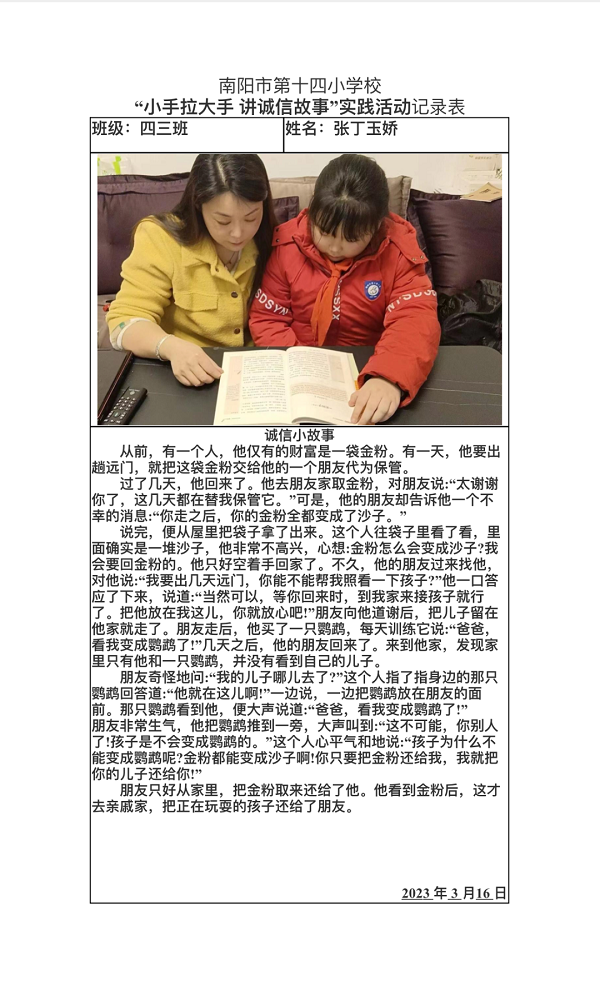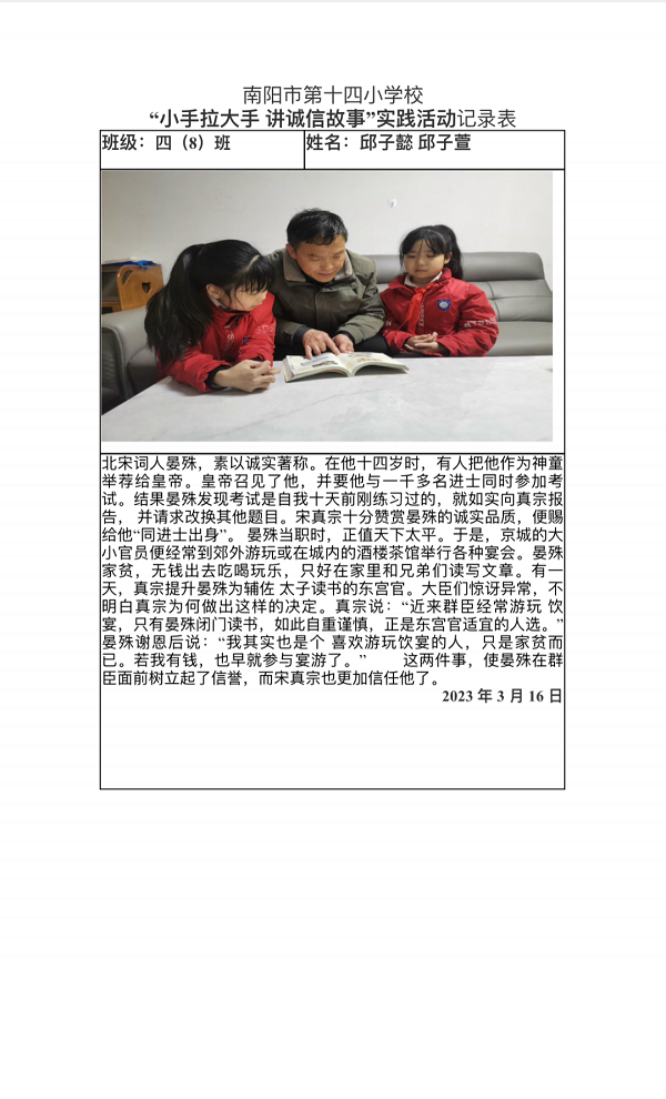 亲子阅读讲诚信 学校开展“亲子阅读讲诚信”活动,架起了学校和家庭的诚信合育的桥梁,家校携手推动良好的诚信教育,助力学生守规矩、讲诚信。