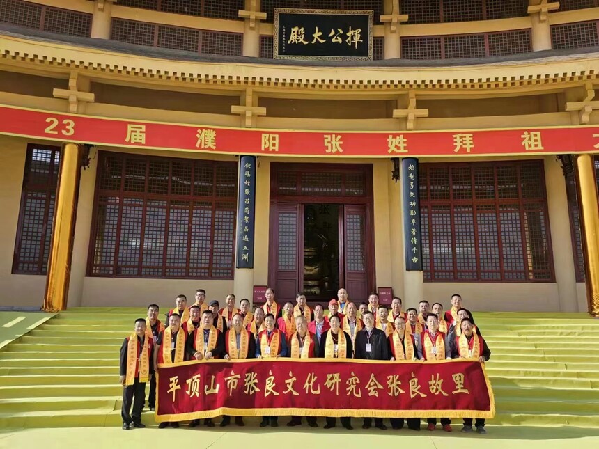 河南:平顶山市张良文化研究会一行参加“第23届张姓拜祖大典”活动4月28日,“第23届张姓拜祖大典”活动在河南濮阳召开。平顶山市张良文化研究会一行38人在平顶山市张良文化研究会会长张伟先生的带领下,应邀参加了庆典活动。 4月28日,是一年一度的祭拜挥公大典之日,来自五洲各地的张氏族亲千余人肃然伫立,武警列阵将祭祀花篮擎至祭坛,省市政协领导及海内外宗亲代表为花篮展带致敬,现场呜炮19响。大会依照祭祀规程进行了献五谷、献祭肉、献佳馔、献时鲜、献美酒等议程,其次分次向始祖挥公上香鞠躬。拜祖大典活动以致祭文、颂祖恩、献歌舞而达到高潮。典礼结束后全体宗亲在挥公园大门前合影留念。 庆贺午会上,来自各地宗亲捐款献物。平顶山市张良文化研究会会长张伟先生向大会捐款献物,并承担了平顶山市拜祖团队的一切费用。同行的平顶山市姓氏文化研究会执行会长张宝庆先生捐献活动经费5000元,平顶山市姓氏文化张姓委员会副会长、张良文化研究会常务副会长张汉强先生,代表平顶山市拜祖团向大会捐赠了一件花瓷作品《基石》,并做介绍。《汴城张氏家谱》的主编张辰罡先生将其家谱分赠予马来西亚、台湾、越南、及广州等宗长,将“叙事万言诗《海南行》”十余幅赠送给海南省三亚市张远来等族亲。